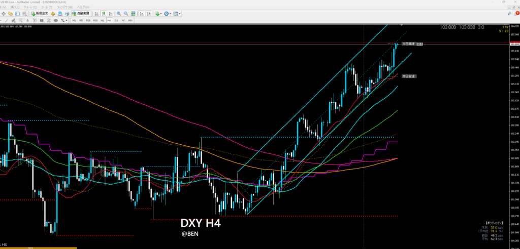 4時間足。めっちゃ強い。103.48を突き抜けて上昇しましたね。この流れだとドルストやGOLDは下目線で見ていく他ありませんね。このチャートを15分足で見てその時間帯の流れをつかむと良いと思いますよ。