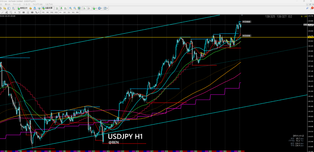 DXYと似たような形ですね。円売りもあり上昇。まだ止まりそうではありません。140円も目前です。3週間くらいまえに140円あるなーなんてLINEでFXの仲間と話をしていたんですよ。もっといえば152円から120円台に落としたときに、二番天井作ってないから140円くらいまでは戻さんと気持ち悪いよなと、今年2月に言ってたんですよね。