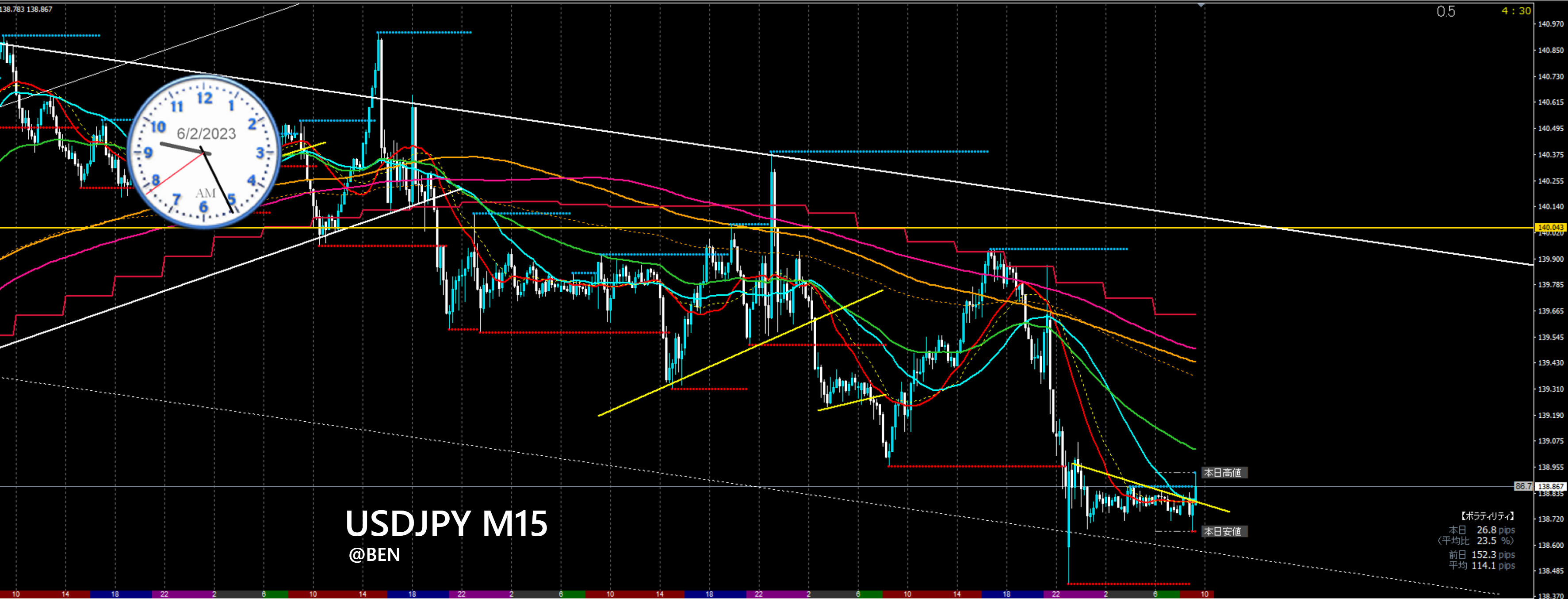 ドルが弱い。明らかなダウントレンドになっています。今朝は買戻しが入ってもおかしくないところにいますね。少しロング入れてます(10時前)円安も助けて巻き戻しはあるんじゃないかなと。