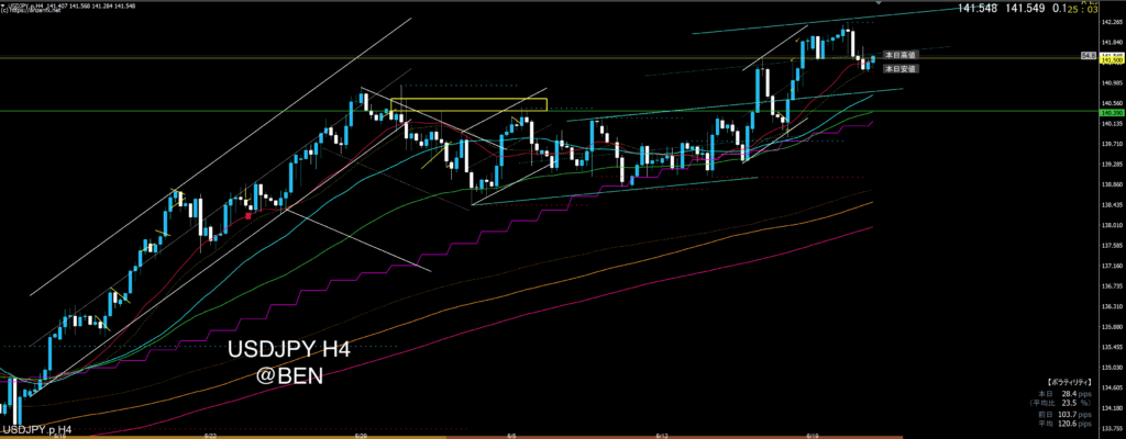 4時間足。強い。昨日は口先クソ介入がありましてね、午前中の東京時間は円買い(142.24を超えず)。日中80pipsほど下落した後、21時半の指標でドル高へ。直近下落の半値ほど戻してからも結局ドル円は売り込まれる形。ドルより円が強かった日でしたね。クロス円全体に下落基調。