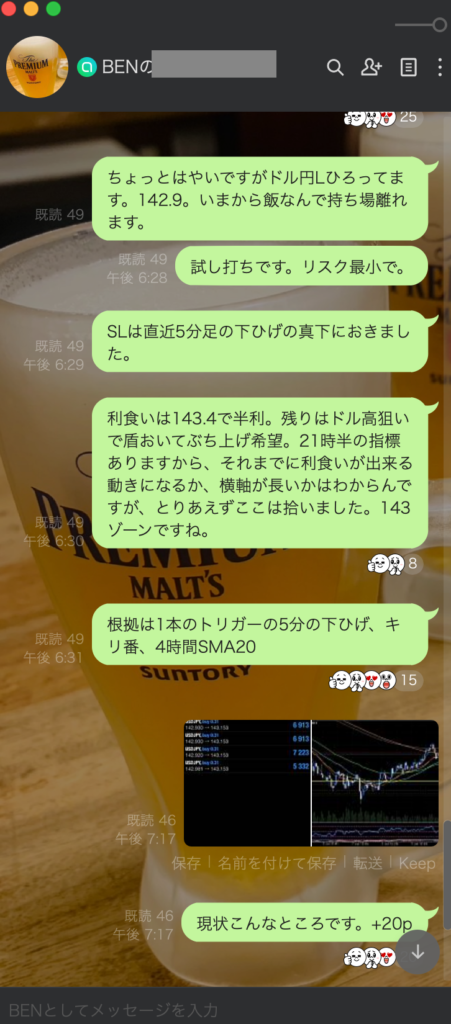 平日の夕方以降、相場をみながらGOLDを主に相場見解を書きつつスキャをしています。Memberの皆さんもそれぞれに結果報告や見解をLINEしていただいております。
