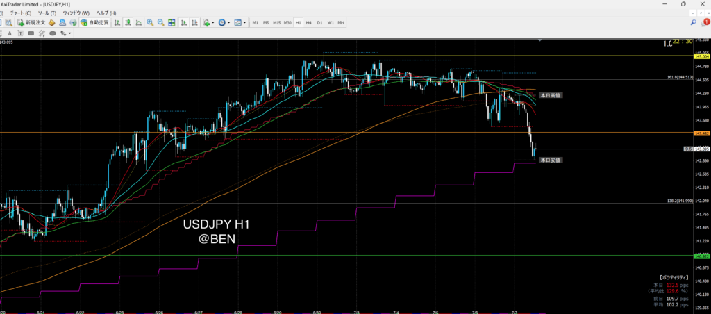 で、その調整が2日前から来ている。143円で先ほどロンドン時間にとまったので、とりあえずは拾っています。ボラが達成している(1日平均を余裕で超えています)ことから反転するんやろ、と。