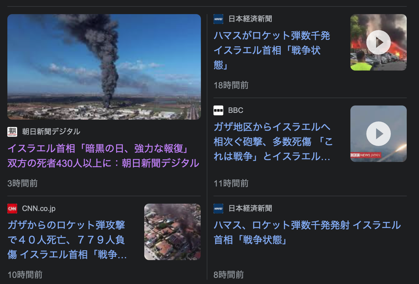 先日、パレスチナがイスラエルの民間人をランダムに射殺、民間人を含む軍人を捕虜に取るなどの蛮行を繰り返しました。既に数百人以上の死傷者が出ており、まさに戦争状態。